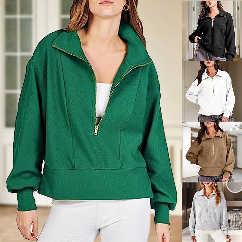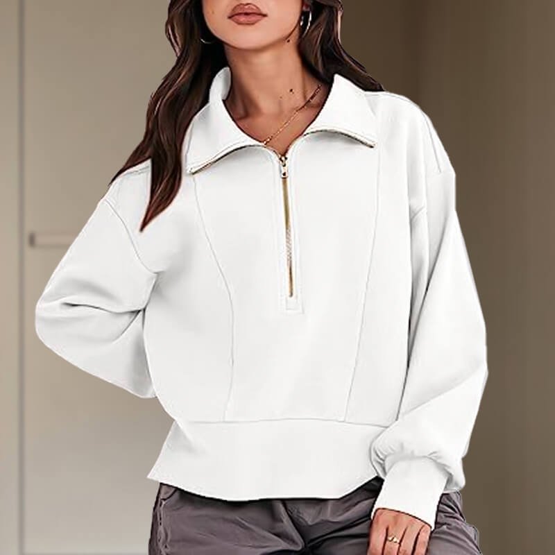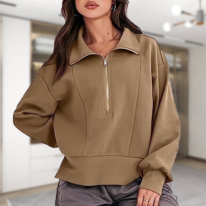 This Loose Zip Neck Long Sleeved Sweater Top is made from a soft and comfortable material that will keep you warm and cozy.